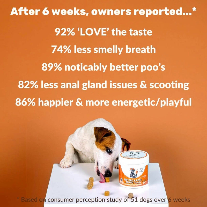 Our treats offer 120 Pre, Pro & Postbiotics per tub, with 2-3x more potent ingredients than other brands. Made with 100% natural ingredients, grain-free, and GMO-free, they’re the healthy choice for your pet. Loved by dogs and backed by a 100% satisfaction guarantee—give your dog the best!