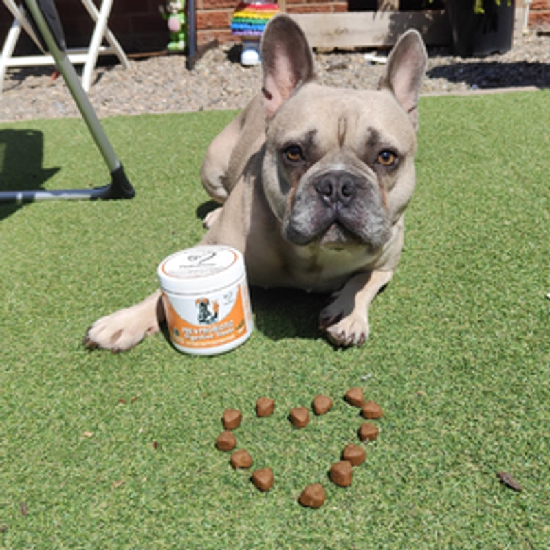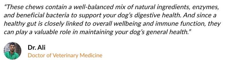 Vet-formulated chews that support digestion, immunity, mood, and common issues like bum scooting, loose stools, itchy skin, paws, and ears — all in one tasty, easy daily treat.
